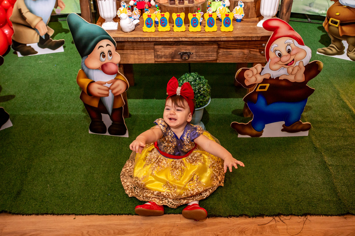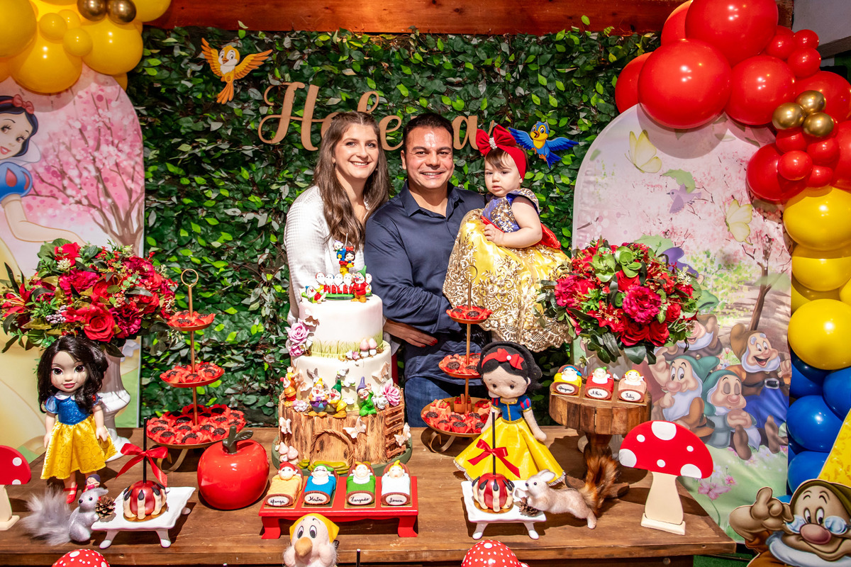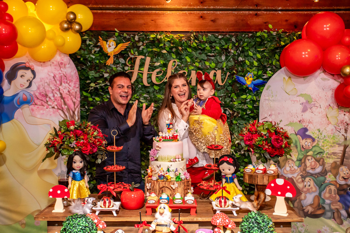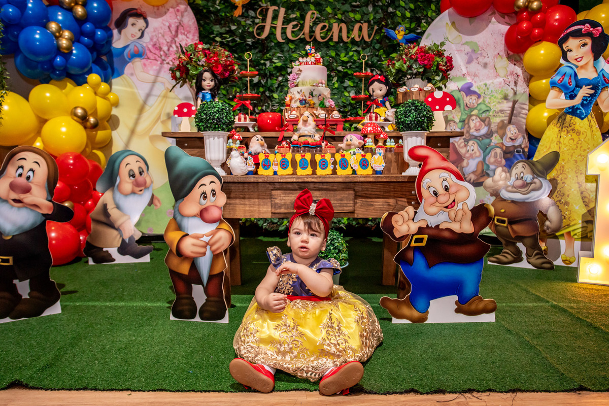 Teve festinha da branca de neve para 1° da Helena...